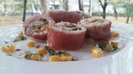 Se rupe una bucată folie de aluminiu, pe care am uitat să o măsor 😛 , se pune una bucată felie de bacon, apoi peste bacon se pune una bucată carne şi apoi umplutura. Se rulează şi la sfârşit se împătură în folie de aluminiu şi se strânge la capete.