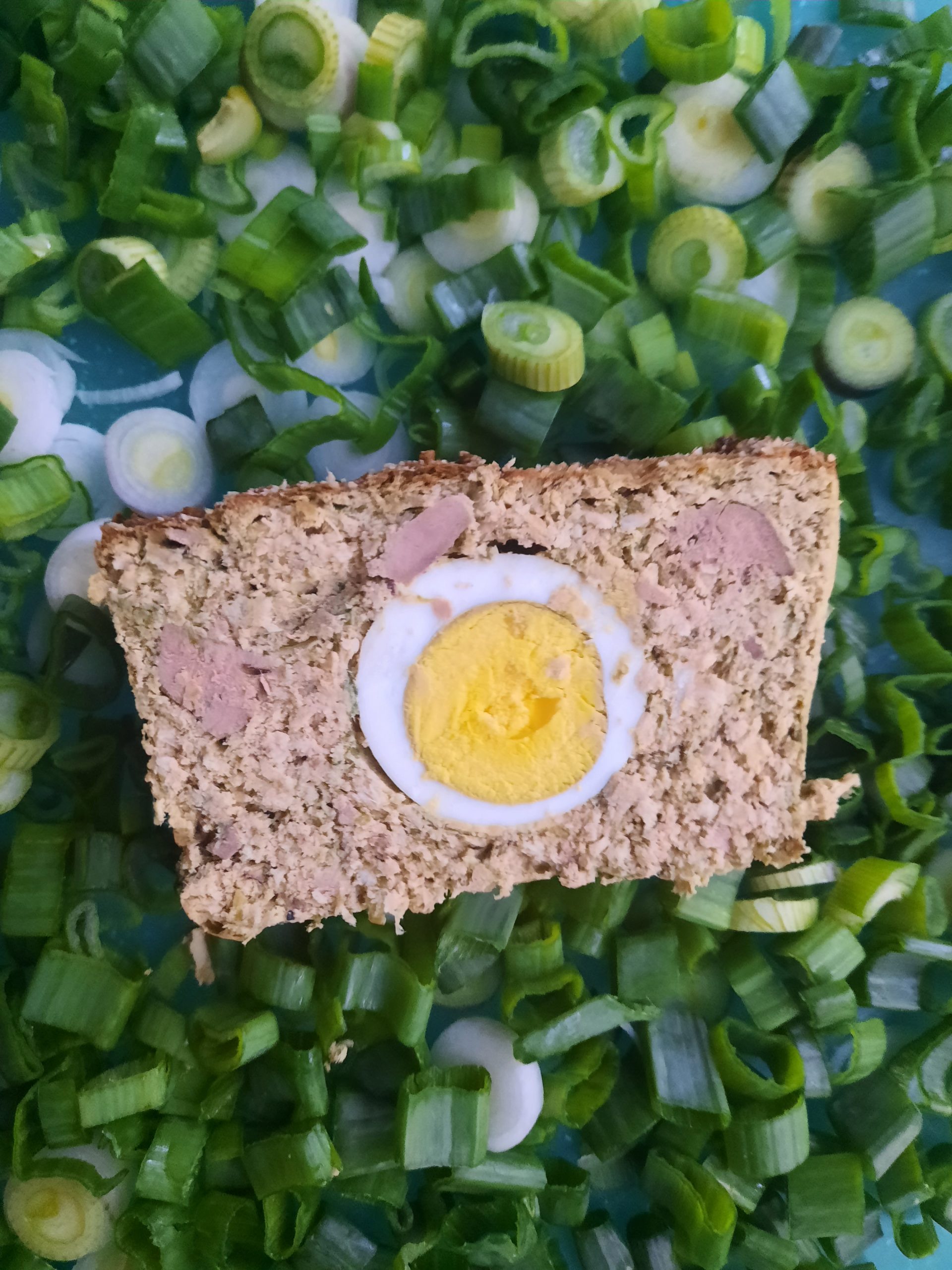 Se pune jumate din compoziţie în vas, apoi se pun cele 8 jumătăţi de ou fiert peste amestec. Apoi se acoperă cu jumatea de compoziţie rămasă.