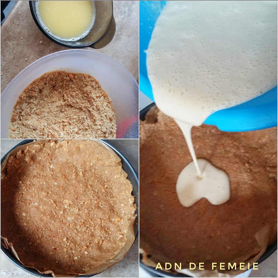 Pentru început, am pregătit blatul din biscuiţi. Într-o tavă rotundă cu fund detaşabil, am pus hârtie de copt. Apoi am sfărâmat biscuiţii şi ama dăugat untul topit. Acest amestec a venit tapetat în forma tăvii, nu doar în partea de jos, ci un pic şi pe laterale. Tava apoi a mers la cuptor, până am terminat eu crema de făcut.