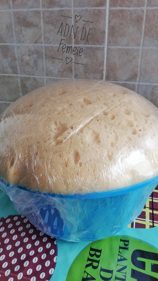 Într-un bol înalt, tapetat cu făină, acoperit cu folie alimentară, băgat la căldură între cearceaf şi plapumă. Şi după 1 oră……. Iete rezultatul!