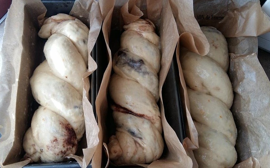 Fiecare bucată de cozonac este formată din două părţi de aluat rulat sub formă de ruladă. Acele forme se răsucesc apoi una peste cealaltă, până arată bine 😉