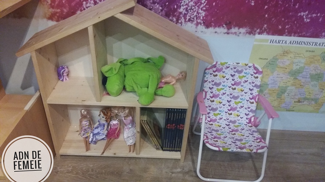 - O căsuţă din lemn– Care acum este doar a păpuşilor. A fost drăguţă fetiţa şi a lăsat un compartiment şi pentru cărţile ce nu au mai avut loc în dulap.