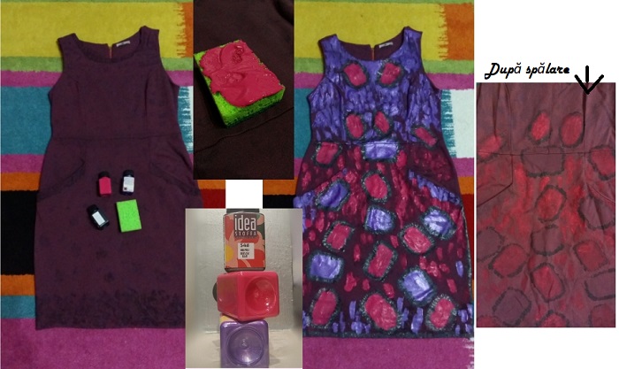 Nemulțumită de rezultat, am zis că voi face ceva artistic cu ajutorul vopselei lichide. Și am trecut la treabă. Vopsea și burete de vase. Apoi lăsat la uscat… însă la spălare a ieșit mare parte din vopsea! Chiar dacă am făcut totul conform instrucțiunilor!