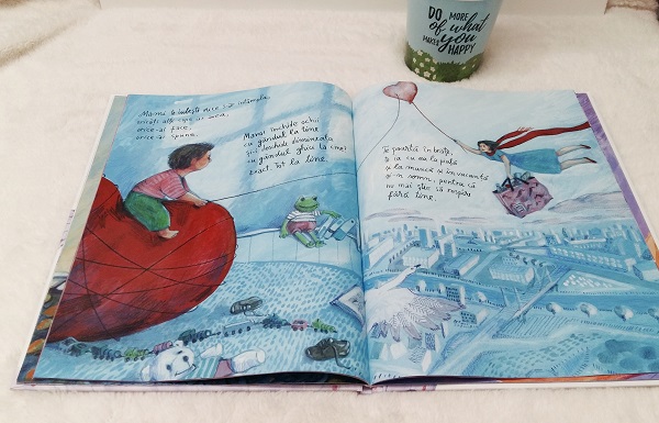 ” Luați-vă copilul în brațe și porniți împreună într-o călătorie pe care nici el, nici voi, părinții, n-o s-o uitați niciodată: copilăria mamei, cu trăsnăi și planuri, întâlnirea ei cu cel care-i va deveni soț, dorința lor de a crea împreună pe cineva mai bun decât ei doi la un loc, sarcina plină de dragoste, nașterea cu efort și speranța, firul invizibil care leagă orice copil de mama lui, care crește și învăluie totul chiar și când mama e obosită, nervoasă ori departe.”