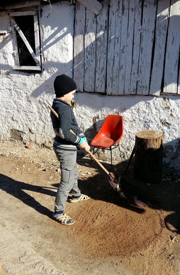 Târșul este mai greu de mânuit. Dar nu se lasă băiatul meu și face curat în stil propriu. Și învață pe propria piele cum se ține un târș/mătură, astfel încât să aibă spor. Asta însă nu îl împiedică să facă modele în curte…