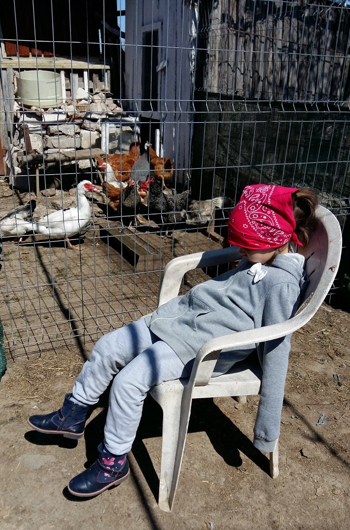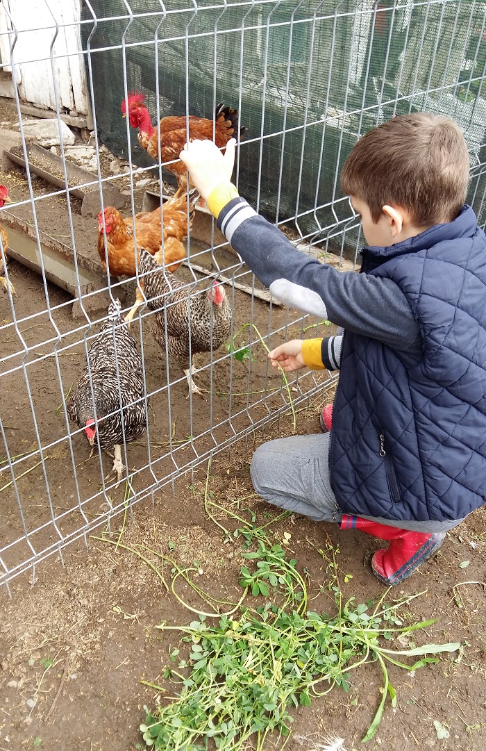A fost o provocare și să se obișnuiască cu hrănitul găinilor. Fir cu fir, prin gard la început, s-a obișnuit cu ele.