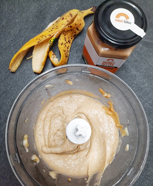 În blender am pus 1 banană și cele 3 linguri de unt de arahide și le-am mixat bine. Până a devenit cremos amestecul.