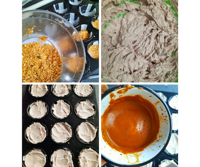 Separat, am pus ciocolata și untul la topit. Apoi am adăugat crema de cafea peste. Din acest amestec am adăugat peste mini cheesecake câte un pic peste fiecare – am pus astfel încât să rămână amestec. Și am lăsat câteva porții și fără glazură pentru copii. Și am pus iar tava la rece.