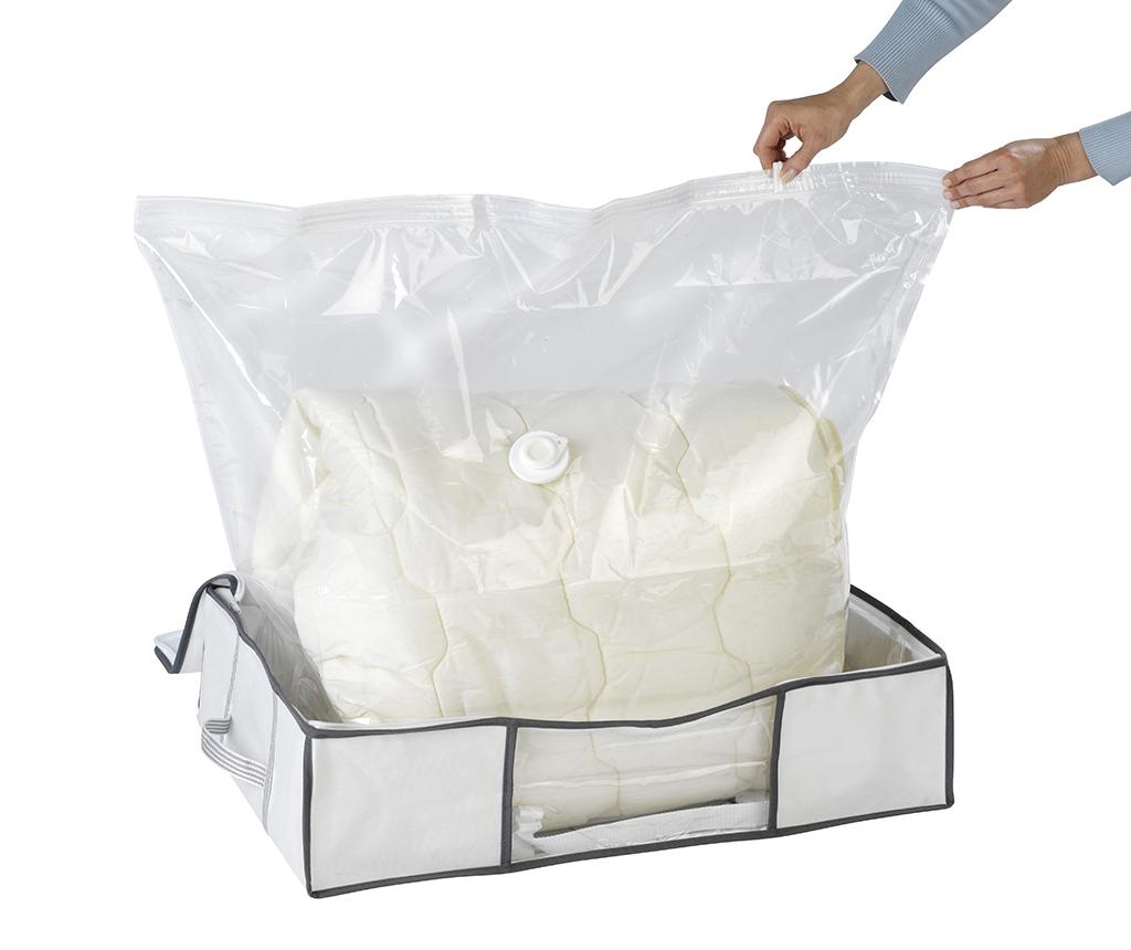 2, Depozitare haine. Hainele de sezon se pot schimba între ele în dulapul existent, iar depozitarea schimbului este altfel atunci când ai la îndemână husă pentru depozitare cu sac de vidat inclus. Se poate folosi atât la lenjeria de pat mai groasă, dar și la hainele de iarnă ce ar ocupa extra spațiu în garderobă.