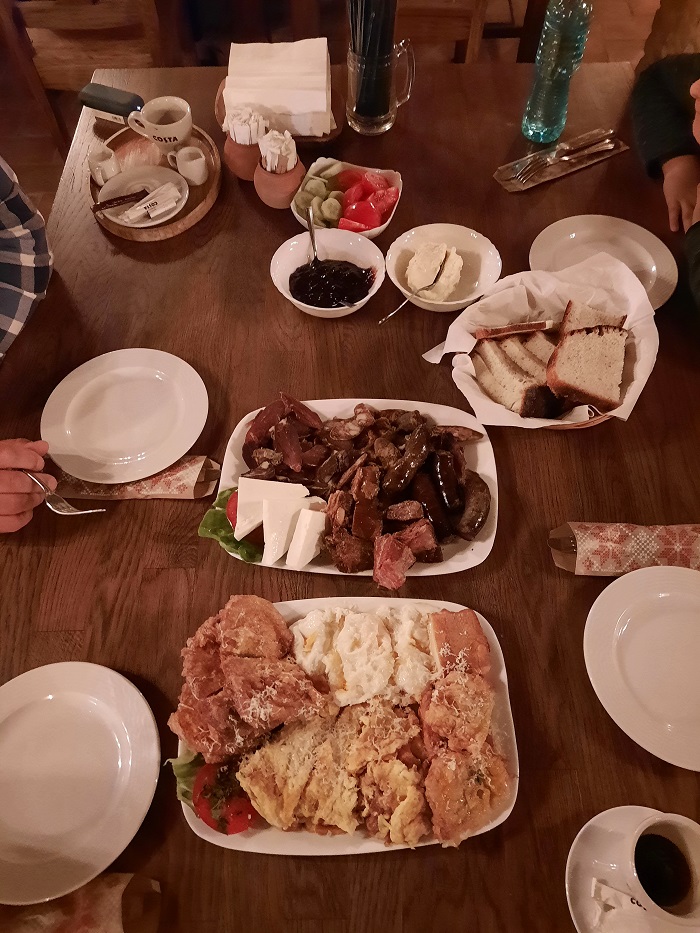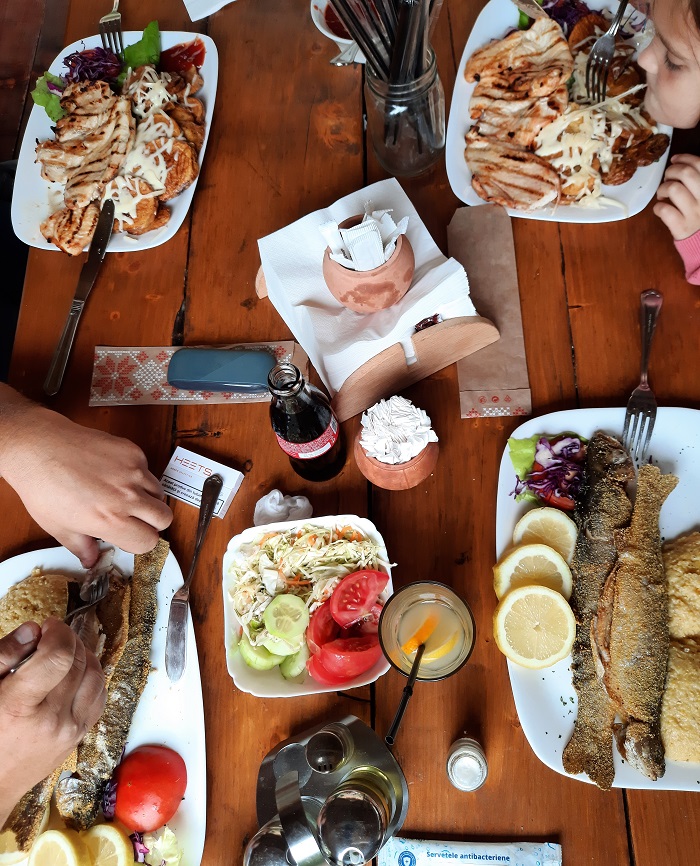 Noi am comandat două porții din specialitatea casei – Mămăligă cu păstrăv prăjit și mujdei plus două porții de salată e crudități, iar copiilor le-am comandat două porții de cartofi prăjiți cu grătar din piept de pui.