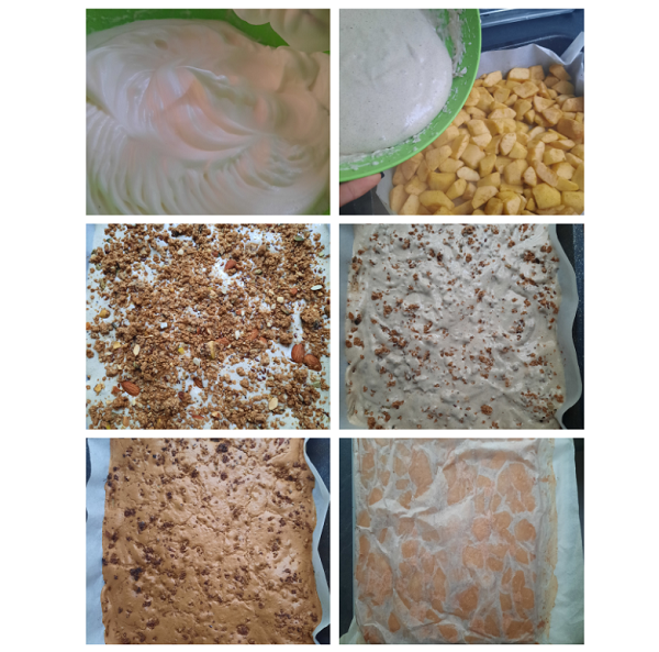 Am scos tava cu merele, am adăugat aluatul peste mere, apoi am adăugat granola și am amestecat ușor cu furculița, ca să intre un pic granola în aluat.