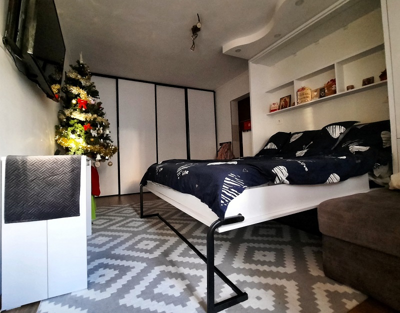 Camera mare, cea în care ținem masa, este una de dimensiune medie spre mare. Însă în această încăpere avem mobilier modular, care este soluția potrivită familiei noastre. Apartamentul este cu două camere, însă noi l-am modificat în unul cu trei camere, bucătăria ajungând pe balcon. Camera mare, ce este și cameră de zi, este și dormitorul meu și al soțului.