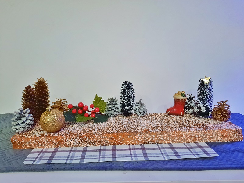 Folosind spray-urile comandate de pe site am personalizat câteva conuri culese din parc și o bucată de polistiren a primit un strat de lac și zăpadă artificială. Apoi le-am combinat cu câteva decorațiuni și a ieșit ce se vede mai jos.