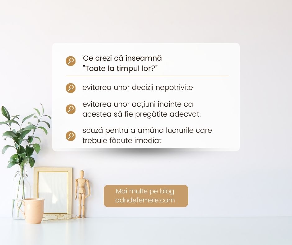 Da, sunt de acord cu ideea conform căreia unele lucruri, unele proiecte, unele acțiuni, unele relații doar în anumite contexte și condiții se pot realiza. Și da, toate la timpul lor are sens dacă mă gândesc la acest aspect. Însă există și reversul medaliei, conform căreia n-are sens să fac atâtea, că lucrurile se vor așeza ele singure. Pe ideea ”Dacă e să se întâmple, se va întâmpla”.