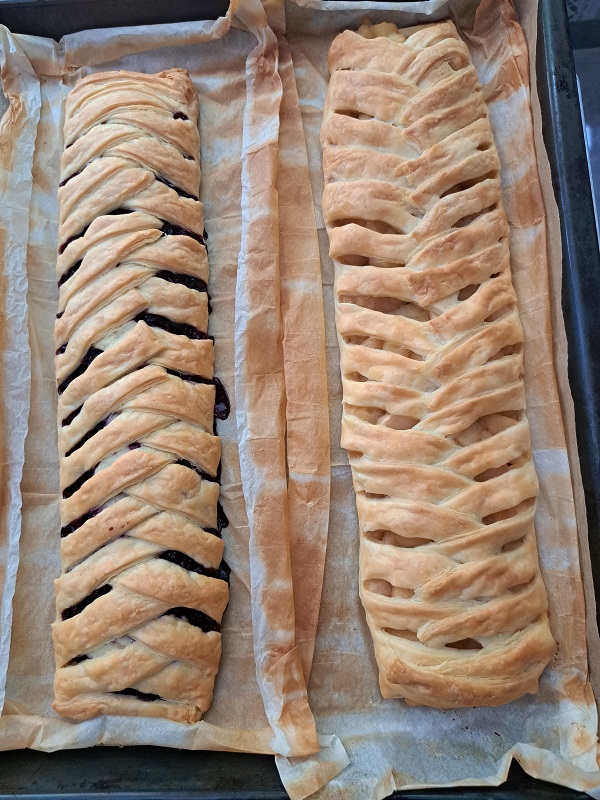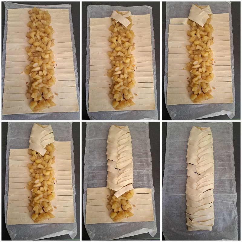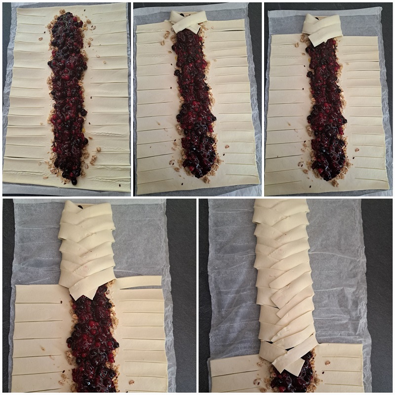 Scot aluatul din folie și îl desfac, fără a-l separa de foaia în care este învelit. Și încep să trasez o linie cu cuțitul dinspre mijlocul aluatului spre margine, lăsând mijlocul intact, formând astfel ”biletele atasate de foaie”. Această acțiune se face pe ambele părți. În mijloc, unde nu este tăiat, pun musli, apoi umplutura. Musli are rol de a absoarbe din umplutură astfel încât să nu fie atât de umed încât să nu se coacă.