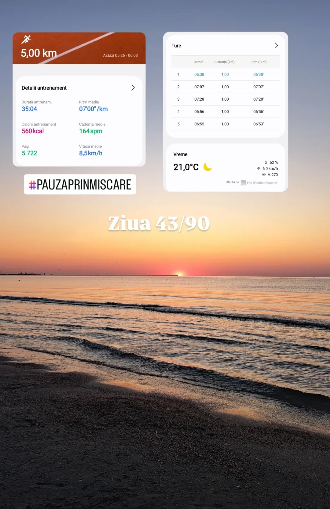 Ziua 43/90 prima alergare pe malul mării la răsărit.