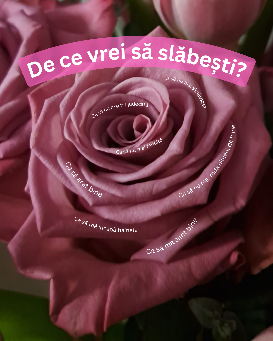 Ce, vrei să slăbești ca să te simți bine, ca să fii mai sănătoasă, ca să fii fericită, ca să te încapă hainele, ca să nu mai râdă lumea de tine, ca să nu te mai simți prost când ești cu un grup de persoane de ”alte dimensiuni”?” Ok. Și când atingi și pentru o scurtă perioadă de timp acel obiectiv propus ce se întâmplă? Ce faci mai departe?